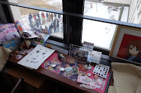 それと近くには「おおむら」って文房具屋があります。まあ見た目は普通の文房具屋なんですが、中には同人誌コーナーがあってけいおんの同人誌を売っていたり、ファンの寄贈品が飾ってあったりします。